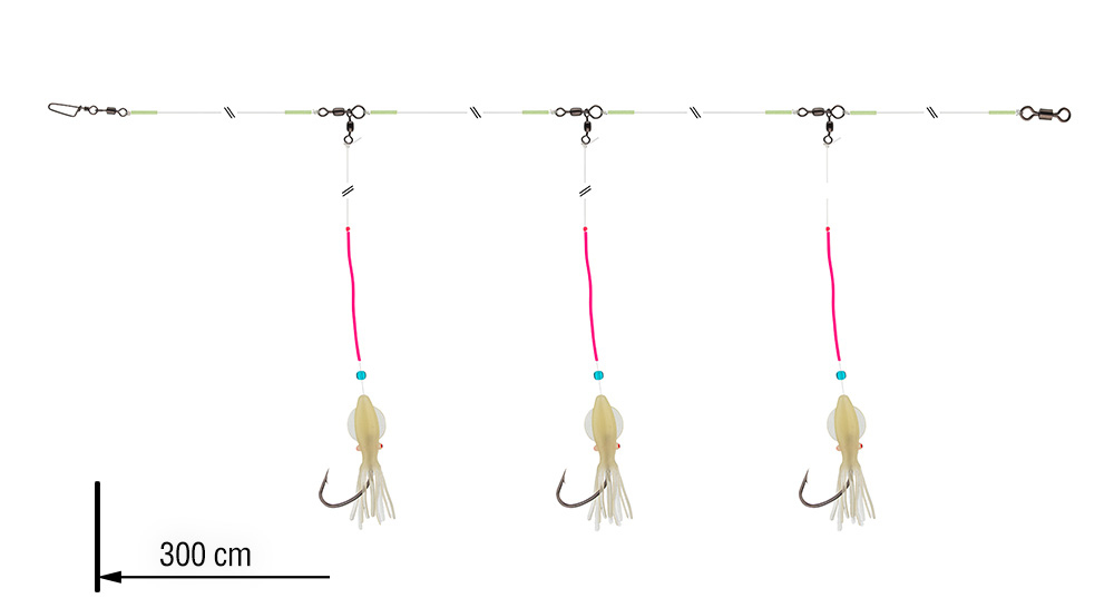 Tento návazec je navržený pro lov štikozubců a tresek. Velké háčky se hodí pro použití v kombinaci s přírodní nástrahou a zabraňují ztrátě vašeho úlovku. Speciální rotační obratlíky na obou stranách a ochrana uzlu spolu s hadičkou u chobotničky zabraňují zamotávání návazce při klesání do velké hloubky. Perfektní volba pro lov ve středním a severním Norsku!