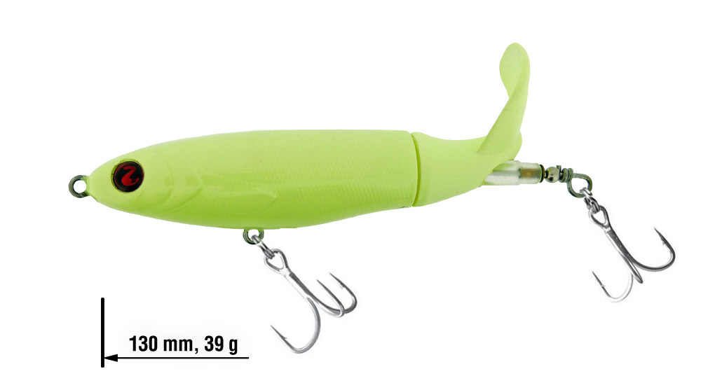 Můžete jej táhnout pomalu, rychle, pozastavit, či rychleji a nepravidelně popotahovat. Největších úspěchů a vyprovokovaných záběrů jsme však měli při plynulém a pomalém přitahovaní. Přitahujte Whopper tak, aby se lopatka točila a stále plopala konstantní rychlostí. Veškeré varianty Whopper Plopper jsou již osazeny kvalitními X-Strong trojháčky.